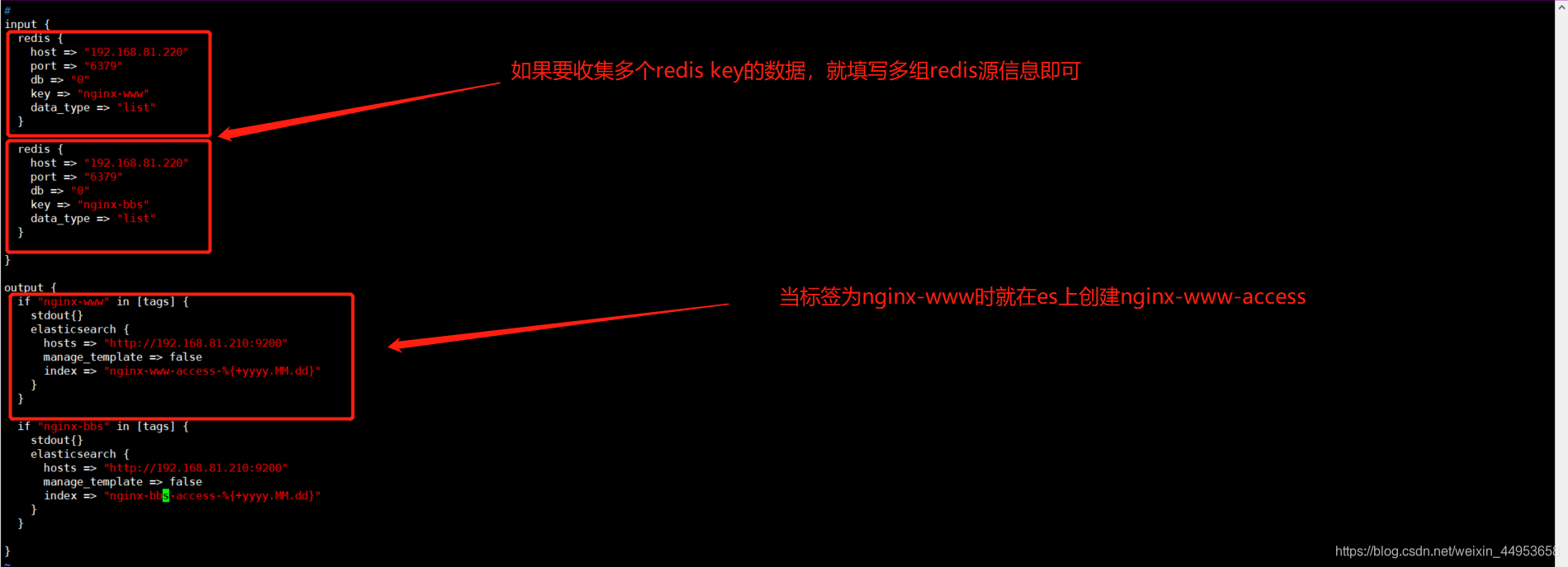 input { redis { host => "192.168.81.220" port => "6379" db => "0" key => "nginx-www" data_type => "list" } redis { host => "192.168.81.220" port => "6379" db => "0" key => "nginx-bbs" data_type => "list" } } output { if "nginx-www" in [tags] { stdout{} elasticsearch { hosts => "http://192.168.81.210:9200" manage_template => false index => "nginx-www-access-%{+yyyy.MM.dd}" } } if "nginx-bbs" in [tags] { stdout{} elasticsearch { hosts => "http://192.168.81.210:9200" manage_template => false index => "nginx-bbs-access-%{+yyyy.MM.dd}" } } }