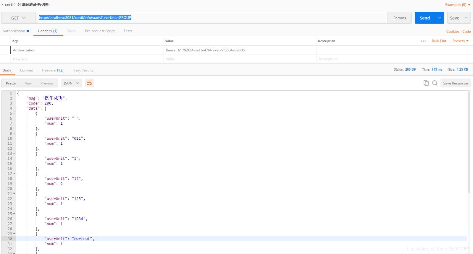 http://localhost:8081/certif/info/statis?trainMajorZh=GROUP 【中文专业分组】 http://localhost:8081/certif/info/statis?userUnit=GROUP 【用户单位分组】 http://localhost:8081/certif/info/statis?certifType=GROUP 【证书类型分组】 http://localhost:8081/certif/info/statis?certifStatus=GROUP 【证书状态分组】