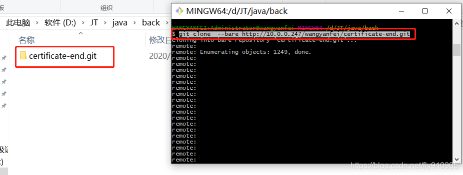 WANGYANFEI+Administrator@wangyanfei MINGW64 /d/JT/java/back // 克隆一份裸版本库 $ git clone --bare http://XX.XX.XX.XX/wangyanfei/certificate-end.git Cloning into bare repository 'certificate-end.git'... remote: remote: Enumerating objects: 1249, done. remote: remote: Counting objects: 100% (1249/1249), done. remote: remote: Compressing objects: 100% (673/673), done. remote: Total 1249 (delta 364), reused 1050 (delta 253) Receiving objects: 100% (1249/1249), 321.04 KiB | 0 bytes/s, done. Resolving deltas: 100% (364/364), done.