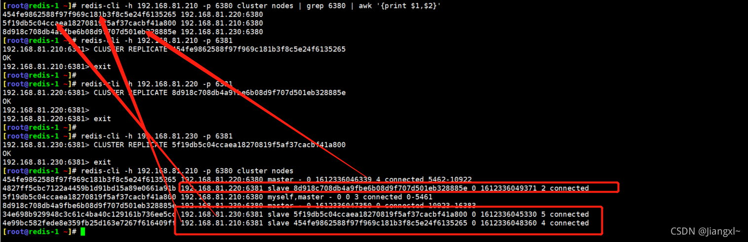 1.获取集群信息 [root@redis-1 ~]# redis-cli -h 192.168.81.210 -p 6380 cluster nodes | grep 6380 | awk '{print $1,$2}' 454fe9862588f97f969c181b3f8c5e24f6135265 192.168.81.220:6380 5f19db5c04ccaea18270819f5af37cacbf41a800 192.168.81.210:6380 8d918c708db4a9fbe6b08d9f707d501eb328885e 192.168.81.230:6380 2.配置交叉复制 [root@redis-1 ~]# redis-cli -h 192.168.81.210 -p 6381 192.168.81.210:6381> CLUSTER REPLICATE 454fe9862588f97f969c181b3f8c5e24f6135265 OK [root@redis-1 ~]# redis-cli -h 192.168.81.220 -p 6381 192.168.81.220:6381> CLUSTER REPLICATE 8d918c708db4a9fbe6b08d9f707d501eb328885e OK [root@redis-1 ~]# redis-cli -h 192.168.81.230 -p 6381 192.168.81.230:6381> CLUSTER REPLICATE 5f19db5c04ccaea18270819f5af37cacbf41a800 OK [root@redis-1 ~]# redis-cli -h 192.168.81.210 -p 6380 cluster nodes 454fe9862588f97f969c181b3f8c5e24f6135265 192.168.81.220:6380 master - 0 1612336046339 4 connected 5462-10922 4827ff5cbc7122a4459b1d91bd15a89e0661a91b 192.168.81.220:6381 slave 8d918c708db4a9fbe6b08d9f707d501eb328885e 0 1612336049371 2 connected 5f19db5c04ccaea18270819f5af37cacbf41a800 192.168.81.210:6380 myself,master - 0 0 3 connected 0-5461 8d918c708db4a9fbe6b08d9f707d501eb328885e 192.168.81.230:6380 master - 0 1612336047350 0 connected 10923-16383 34e698b929948c3c61c4ba40c129161b736ee5cc 192.168.81.230:6381 slave 5f19db5c04ccaea18270819f5af37cacbf41a800 0 1612336045330 5 connected 4e99bc582fede8e359fb25d163e7267f616409ff 192.168.81.210:6381 slave 454fe9862588f97f969c181b3f8c5e24f6135265 0 1612336048360 4 connected