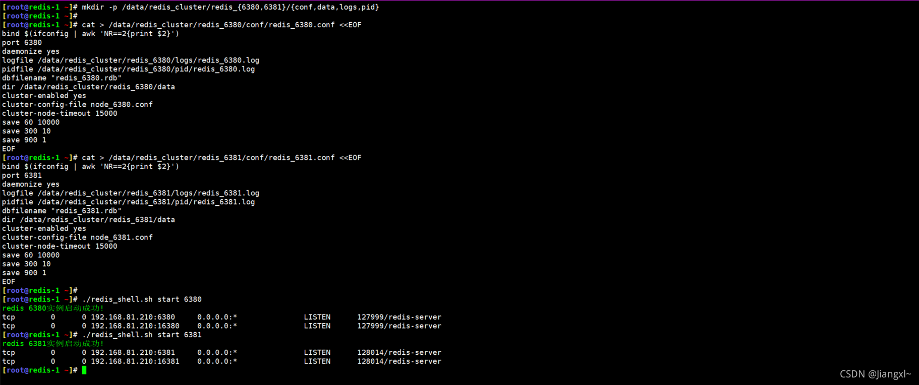 1.创建部署路径 mkdir -p /data/redis_cluster/redis_{6380,6381}/{conf,data,logs,pid} 2.准备配置文件 cat > /data/redis_cluster/redis_6380/conf/redis_6380.conf <<EOF bind $(ifconfig | awk 'NR==2{print $2}') port 6380 daemonize yes logfile /data/redis_cluster/redis_6380/logs/redis_6380.log pidfile /data/redis_cluster/redis_6380/pid/redis_6380.log dbfilename "redis_6380.rdb" dir /data/redis_cluster/redis_6380/data cluster-enabled yes cluster-config-file node_6380.conf cluster-node-timeout 15000 save 60 10000 save 300 10 save 900 1 EOF cat > /data/redis_cluster/redis_6381/conf/redis_6381.conf <<EOF bind $(ifconfig | awk 'NR==2{print $2}') port 6381 daemonize yes logfile /data/redis_cluster/redis_6381/logs/redis_6381.log pidfile /data/redis_cluster/redis_6381/pid/redis_6381.log dbfilename "redis_6381.rdb" dir /data/redis_cluster/redis_6381/data cluster-enabled yes cluster-config-file node_6381.conf cluster-node-timeout 15000 save 60 10000 save 300 10 save 900 1 EOF 3.启动 [root@redis-1 ~]# ./redis_shell.sh start 6380 redis 6380实例启动成功! tcp 0 0 192.168.81.210:6380 0.0.0.0:* LISTEN 127999/redis-server tcp 0 0 192.168.81.210:16380 0.0.0.0:* LISTEN 127999/redis-server [root@redis-1 ~]# ./redis_shell.sh start 6381 redis 6381实例启动成功! tcp 0 0 192.168.81.210:6381 0.0.0.0:* LISTEN 128014/redis-server tcp 0 0 192.168.81.210:16381 0.0.0.0:* LISTEN 128014/redis-server