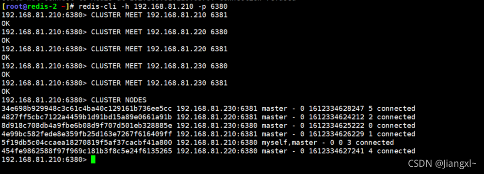 [root@redis-2 ~]# redis-cli -h 192.168.81.210 -p 6380 192.168.81.210:6380> CLUSTER MEET 192.168.81.210 6381 OK 192.168.81.210:6380> CLUSTER MEET 192.168.81.220 6380 OK 192.168.81.210:6380> CLUSTER MEET 192.168.81.220 6381 OK 192.168.81.210:6380> CLUSTER MEET 192.168.81.230 6380 OK 192.168.81.210:6380> CLUSTER MEET 192.168.81.230 6381 OK 192.168.81.210:6380> CLUSTER NODES 34e698b929948c3c61c4ba40c129161b736ee5cc 192.168.81.230:6381 master - 0 1612334628247 5 connected 4827ff5cbc7122a4459b1d91bd15a89e0661a91b 192.168.81.220:6381 master - 0 1612334624212 2 connected 8d918c708db4a9fbe6b08d9f707d501eb328885e 192.168.81.230:6380 master - 0 1612334625222 0 connected 4e99bc582fede8e359fb25d163e7267f616409ff 192.168.81.210:6381 master - 0 1612334626229 1 connected 5f19db5c04ccaea18270819f5af37cacbf41a800 192.168.81.210:6380 myself,master - 0 0 3 connected 454fe9862588f97f969c181b3f8c5e24f6135265 192.168.81.220:6380 master - 0 1612334627241 4 connected