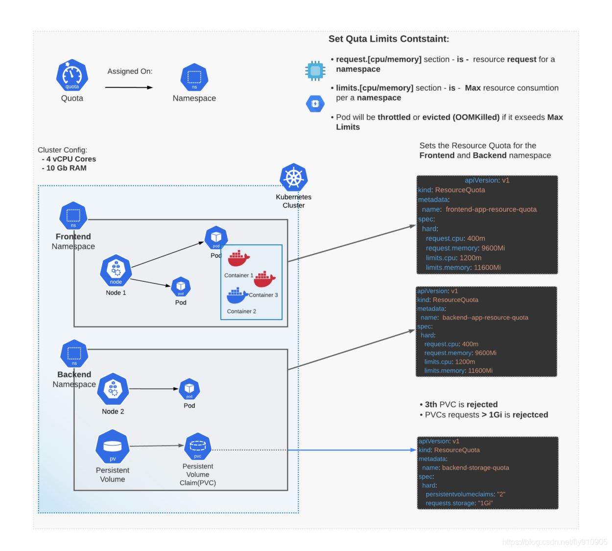 apiVersion: v1 kind: ResourceQuota metadata: name: backend-storage-quota spec: hard: persistentvolumeclaims: "2" requests.storage: "1Gi" -- apiVersion: v1 kind: ResourceQuota metadata: name: backend-namespace-quota spec: hard: request.cpu: 400m request.memory: 9600Mi limits.cpu: 1200m limits.memory: 11600Mi