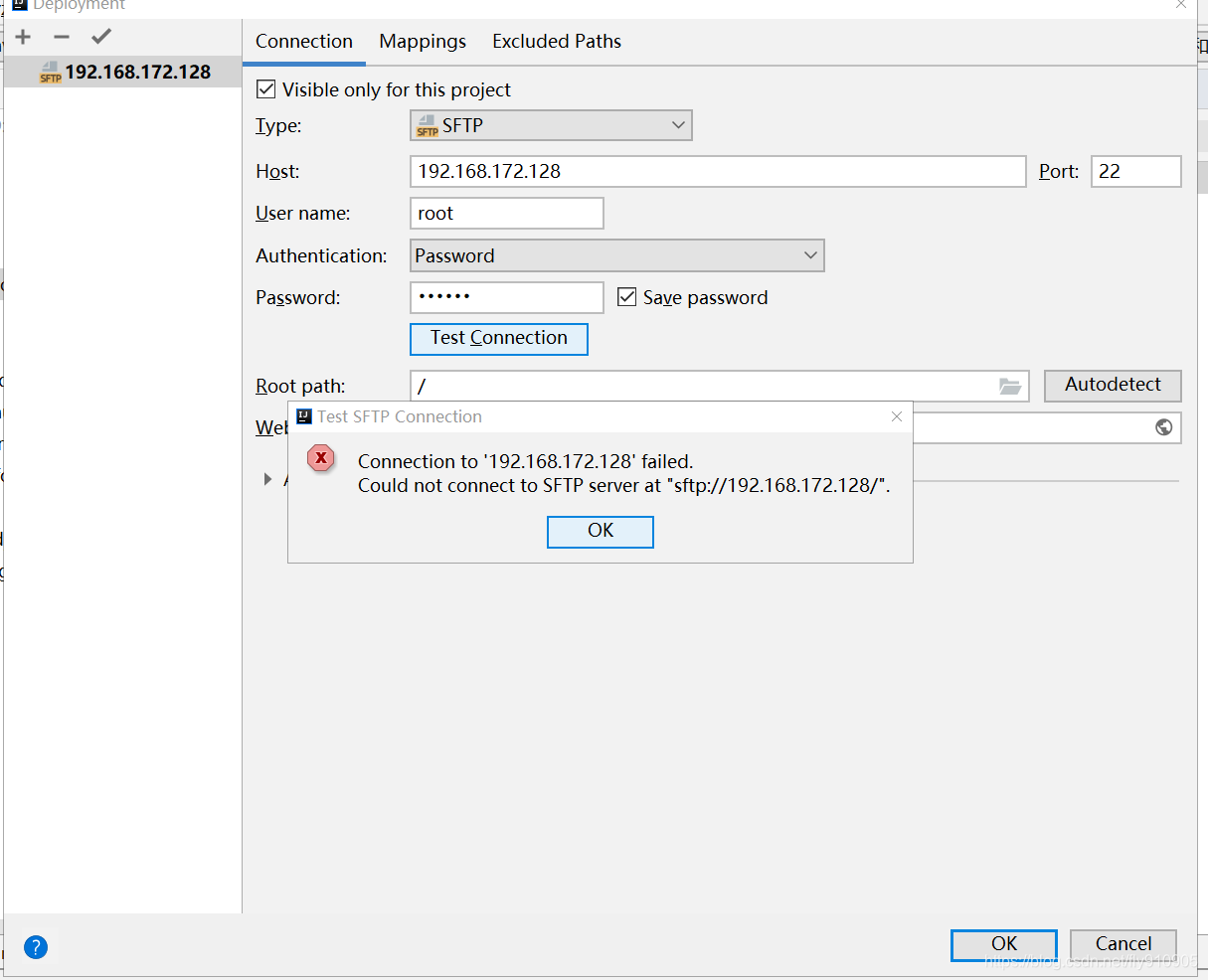 Connection to '192.168.***.**' faild,Could not connect to SFTP server at 'sftp://192.168.***.**'