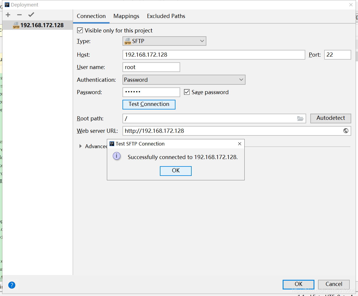 - 补充用户名密码,点击Test Connection按钮,测试连接是否成功(“Root path”指的是登录后访问的目录)