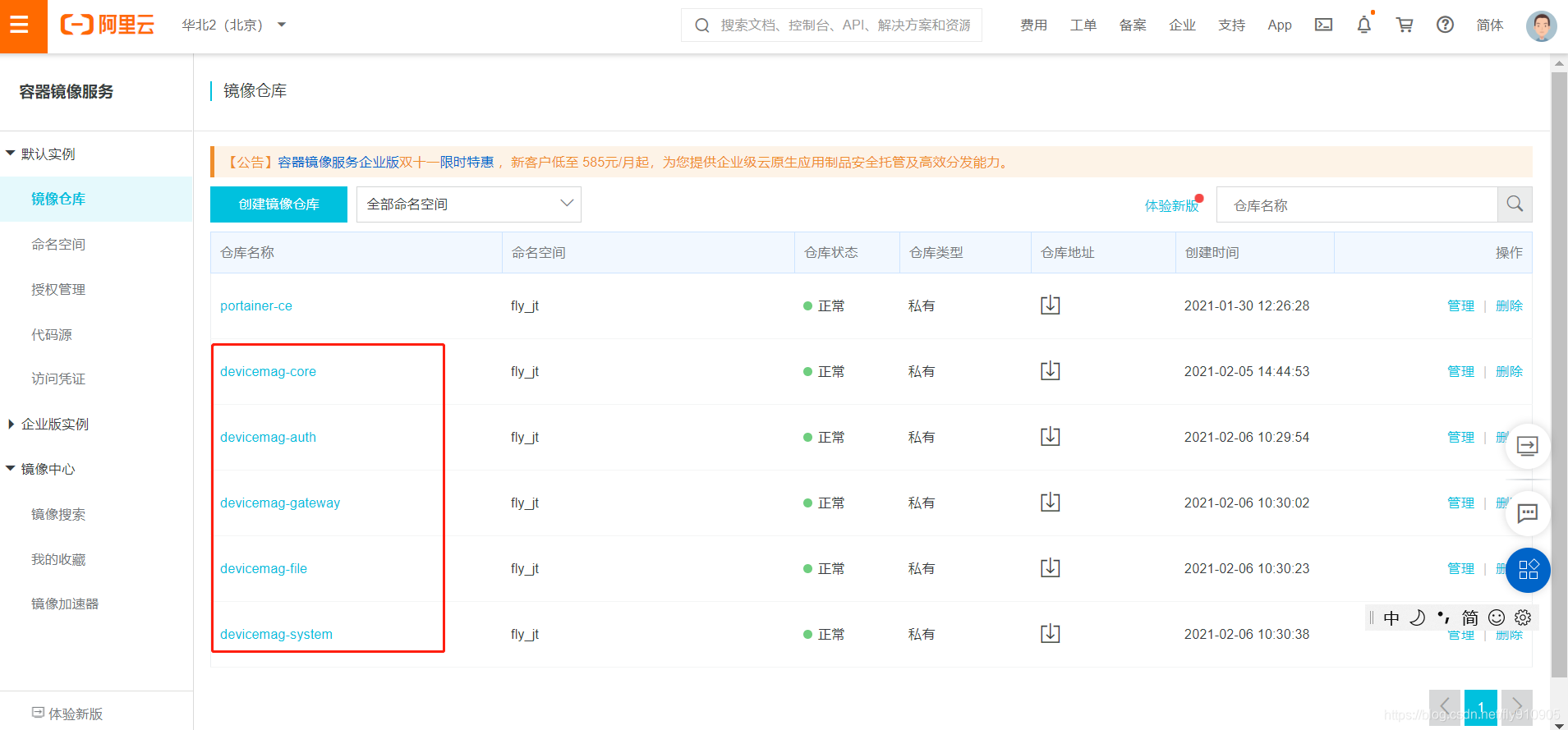 [root@localhost ~]# docker images REPOSITORY TAG IMAGE ID CREATED SIZE registry.cn-beijing.aliyuncs.com/fly_jt/devicemag-file 1.0.0 d09619501d27 11 seconds ago 643MB registry.cn-beijing.aliyuncs.com/fly_jt/devicemag-system 1.0.0 9497ab784991 13 seconds ago 643MB registry.cn-beijing.aliyuncs.com/fly_jt/devicemag-gateway 1.0.0 861d2577311b 16 seconds ago 643MB registry.cn-beijing.aliyuncs.com/fly_jt/devicemag-auth 1.0.0 98ff94ed01d0 17 seconds ago 643MB registry.cn-beijing.aliyuncs.com/fly_jt/devicemag-core 1.0.0 3defff63849a About a minute ago 643MB mysql 5.7 a70d36bc331a 2 weeks ago 449MB redis 5 e35748fd6a72 3 weeks ago 98.4MB portainer/portainer-ce latest 980323c8eb3f 4 weeks ago 196MB registry.cn-beijing.aliyuncs.com/fly_jt/portainer-ce 2.0.1 980323c8eb3f 4 weeks ago 196MB registry 2 678dfa38fcfa 7 weeks ago 26.2MB nacos/nacos-server 1.3.0 d1f1facebfbc 8 months ago 756MB rabbitmq 3.7.15-management f05c3eb3cf91 19 months ago 179MB java 8 d23bdf5b1b1b 4 years ago 643MB [root@localhost ~]#