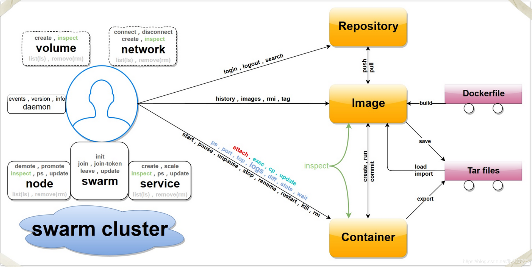 attach、export、inspect、port、ps、rename、stats、top、wait、cp、diff、update |