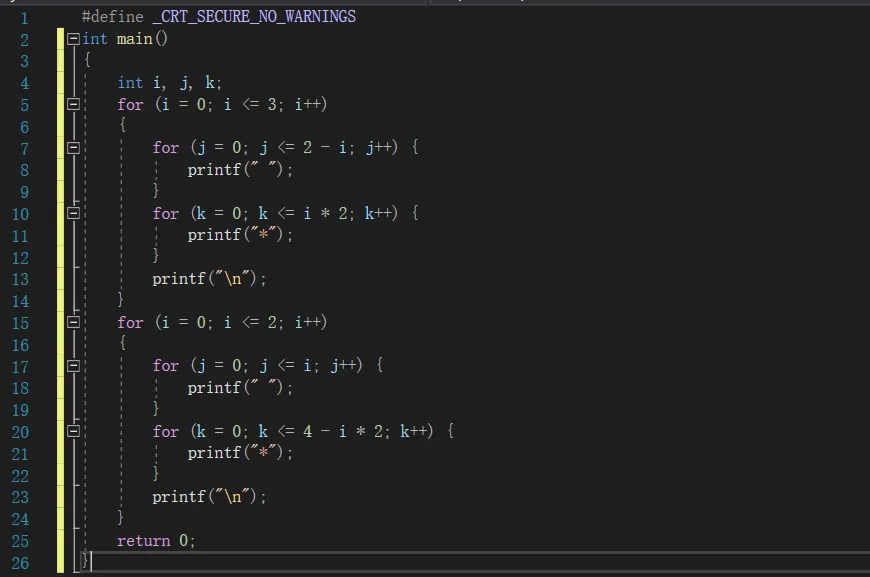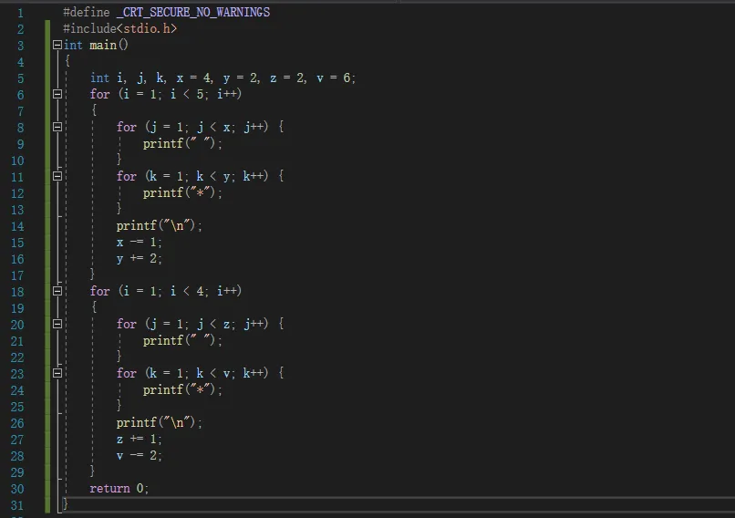 --->此种方法较为复杂, 定义的变量较多,用i的for循环表示行,每一行再分别用for循环打印空格和符号'*',由于范围是变化的如x,y,要找出其中的规律将范围进行改变如x-=1,y+=2;每一行结束用\n进行换行。第二个for与前一个相反,里面的范围也全都相反。