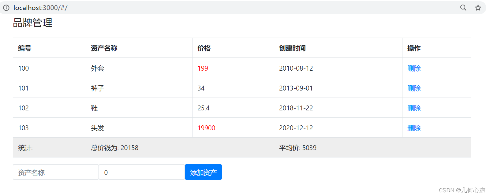 <tr style="background-color: #EEE"> <td>统计:</td> <td colspan="2">总价钱为: {{ allPrice }}</td> <td colspan="2">平均价: {{ svgPrice }}</td> </tr> <script> // 目标: 总价和均价显示 // 1. 末尾补tr - 显示总价和均价 export default { // ...源代码省略 // 2. 计算属性 computed: { allPrice(){ // 3. 求总价 return this.list.reduce((sum, obj) => sum += obj.price, 0) }, avgPrice(){ // 4. 求均价 - 保留2位小数 return (this.allPrice / this.list.length).toFixed(2) } } } </script>
