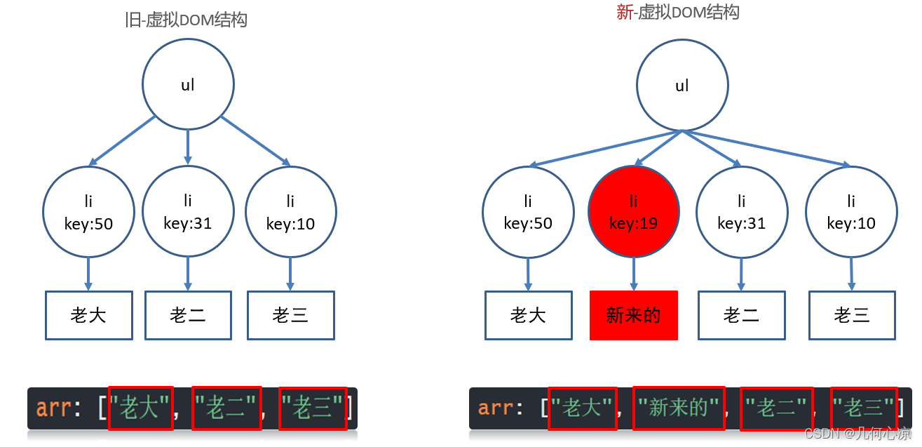 - v-for先循环产生新的DOM结构, key是连续的, 和数据对应