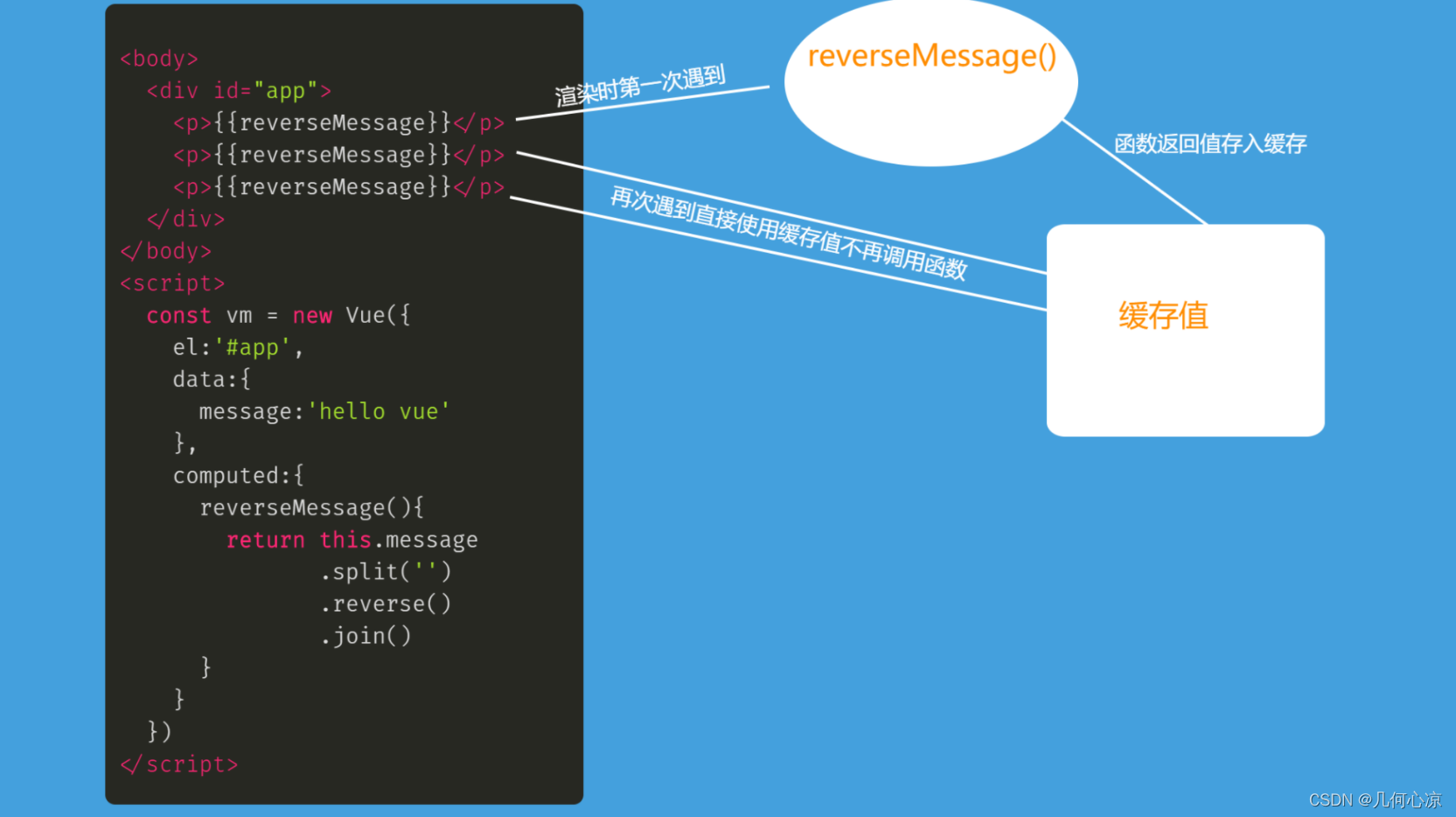 注意: 计算属性也是vue数据变量, 所以不要和data里重名, 用法和data相同