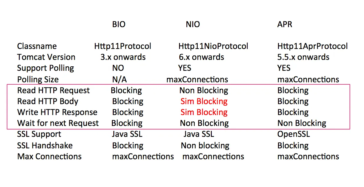 这张表格引用自apache-tomcat官方网站,对于connector的三种模式有很好的对比,上次分享时着重讲NIO模式的实现,所以对NIO也不是完全非阻塞(读body和写response是模拟阻塞行为)的地方用红色突出了一下。这次我们先着重关注一下表格里的 “Wait for next Request” 这一项。它表示的是当开启keep-alive的情况下三种模式对等待下一次请求是否阻塞。