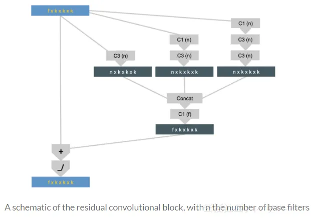 该残差卷积块包含三个不同的堆叠,每个堆叠具有不同数量的卷积层。最浅的堆叠不会扩大接收域,因为它只有一个具有1x1x1过滤器的卷积层。然而,最深的堆叠会扩大接收域。之后,不同堆叠的特征图被连接和缩小后再次与输入图叠加到一起。最后,经过应用ReLu非线性激活函数。