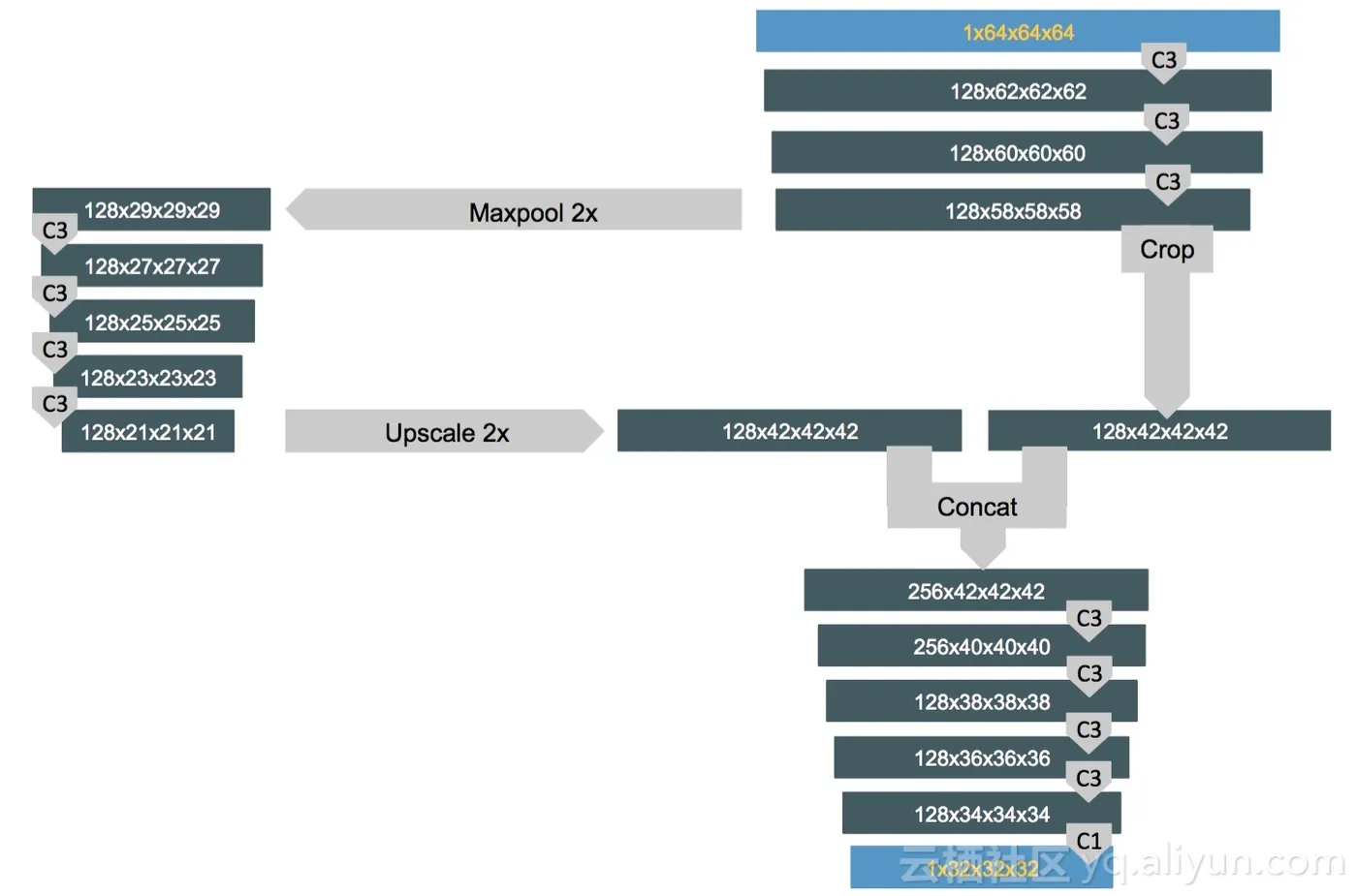 张量形状用深灰色框表示,浅灰色方框内表示网络操作。C1卷积层是1x1x1大小的滤波器,C3卷积层是3×3×3大小的滤波器。将训练好的网络用于分割LUNA和DSB数据集中患者CT扫描图,64x64x64的图像块以32x32x32的速度取出,并将输出拼接在一起后得到的一个张量中,张量中的每个值表示立体像素位于结节内的预测概率。