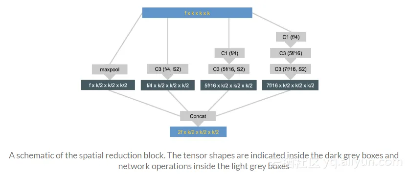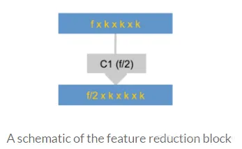 特征缩减块中的1x1x1滤波器内核卷积层是用来减少特征的数量。滤波器内核的数量(f/2)是输入特征图数量(f)的一半。