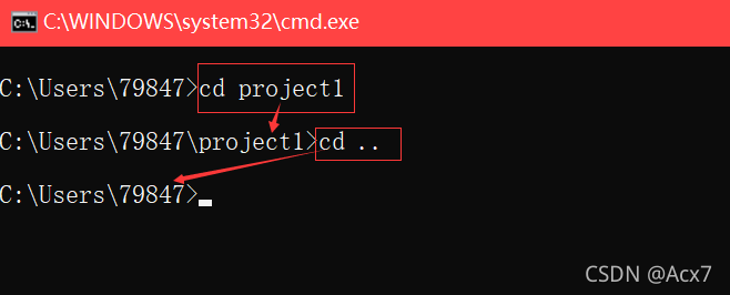 cd 当前目录下目录或绝对路径 // 进入指定目录(可先用dir命令查看当前目录下文件) cd .. // 返回上一级目录