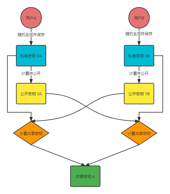 - B 用户使用 XB 和收到的 YA 计算共享密钥 K = YAXB mod p = (aXA mod p)XB mod p = aXA*XB mod p。