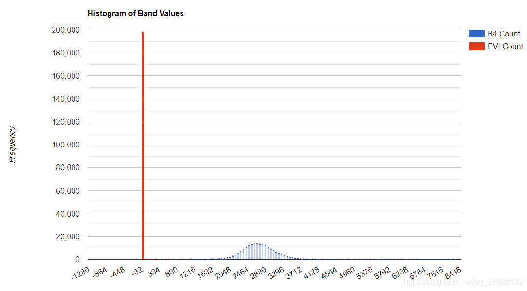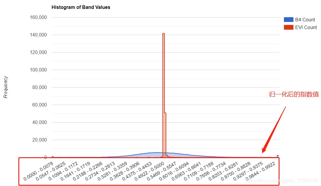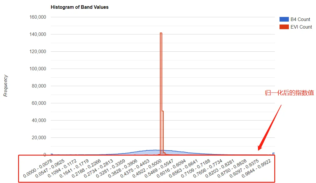 以上是归一化前的统计量,为了和EVI波段明显对比,我使用了一个B4波段作为参照!