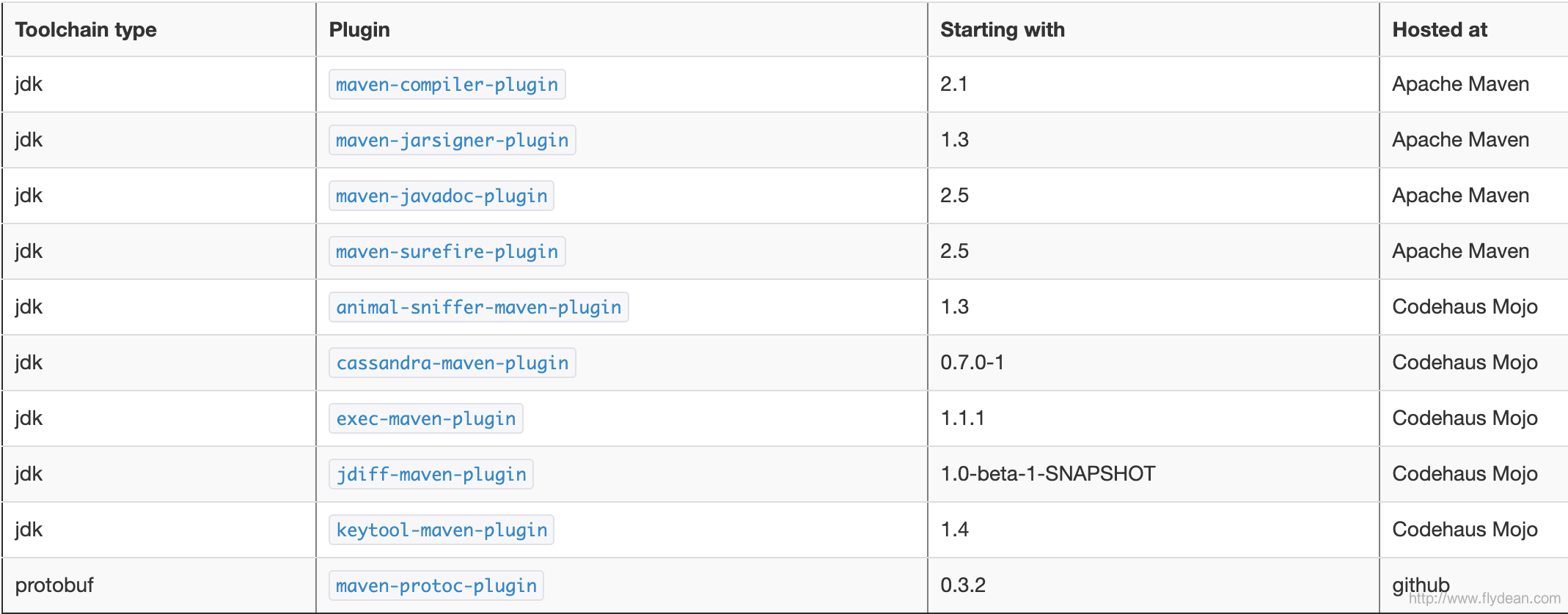 Toolchains是需要和pom中的plugin一起使用的,下面的图中列出了toolchains支持的plugin名字和最低的版本要求。