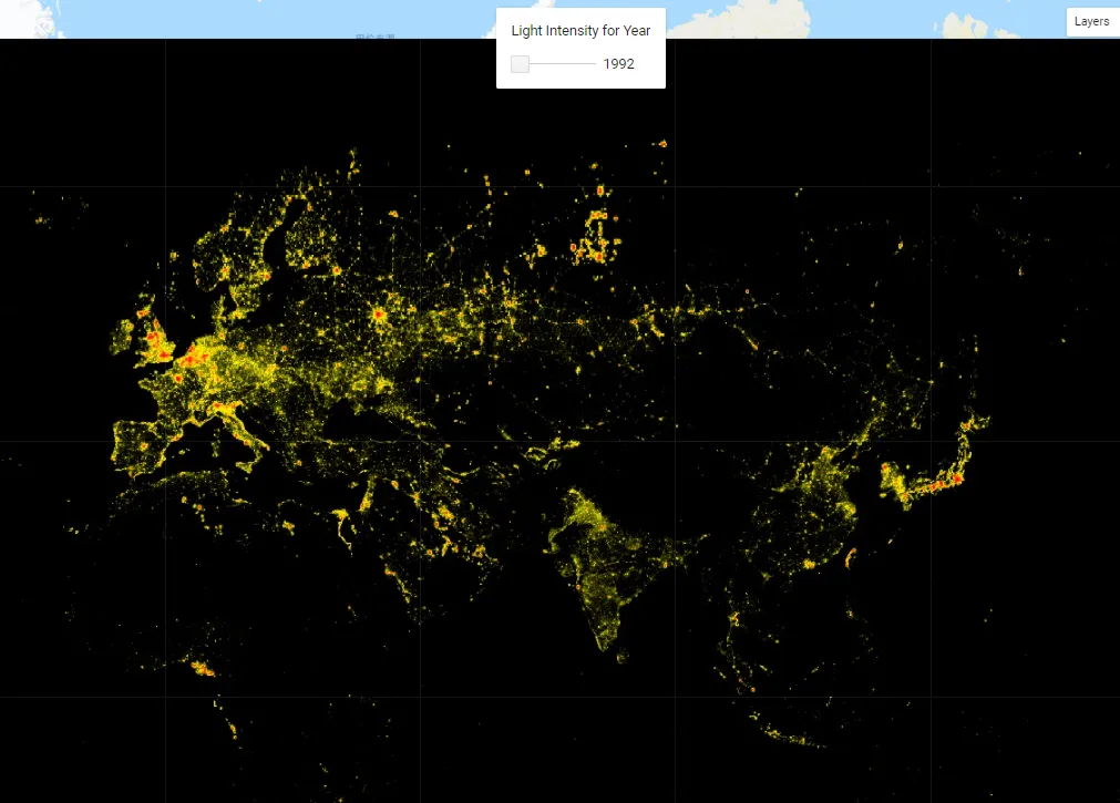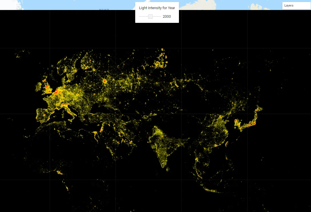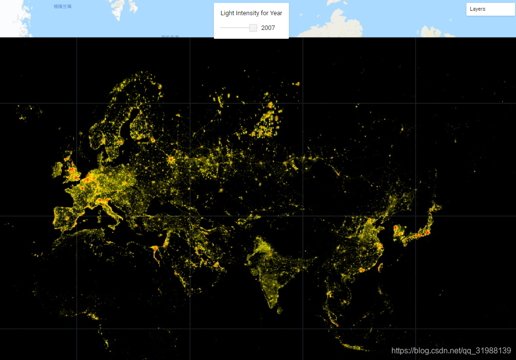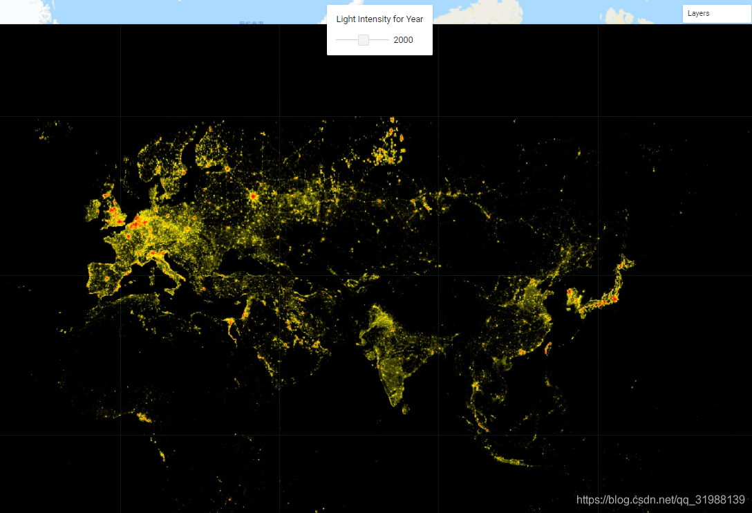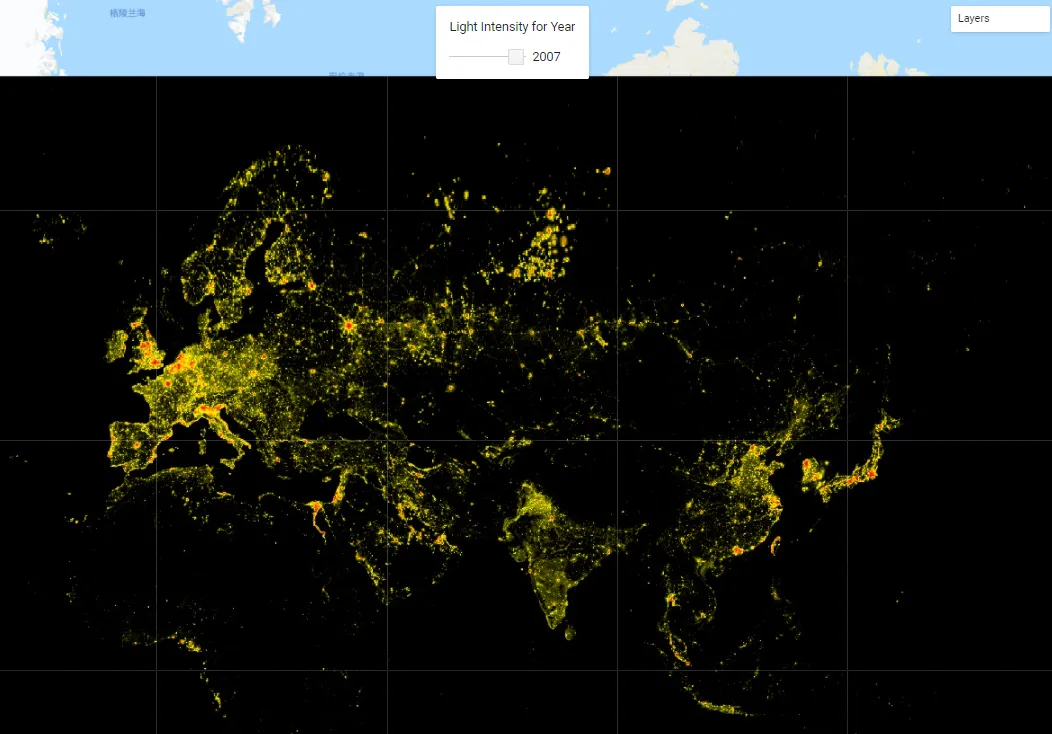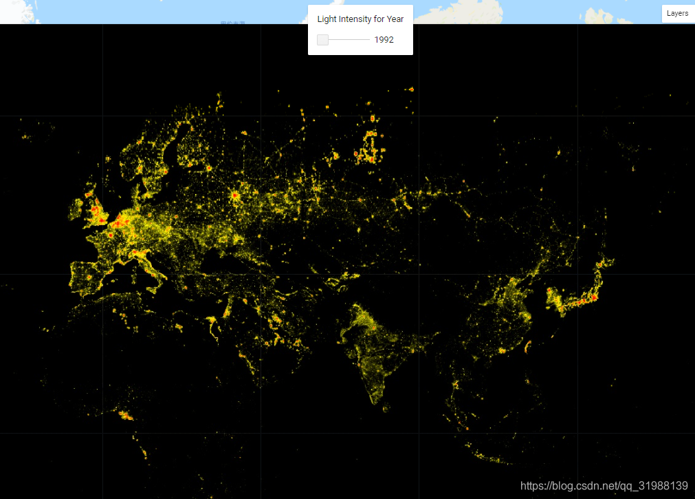 var collection = ee.ImageCollection('NOAA/DMSP-OLS/NIGHTTIME_LIGHTS') .select('stable_lights') // 建立一个函数中主要是展现每一年的数据并且设置时间线和影像色差等的一个循环,其他的数据也可以也可参考加载影像的这种方法。 var showLayer = function(year) { Map.layers().reset(); var date = ee.Date.fromYMD(year, 1, 1); var dateRange = ee.DateRange(date, date.advance(1, 'year')); var image = collection.filterDate(dateRange).first(); Map.addLayer({ eeObject: ee.Image(image), visParams: { min: 0, max: 63, palette:['000000', 'FFFF00', 'FFA500', 'FF4500', 'FF0000'] }, name: String(year) }); }; // 创建标签和滑块。 var label = ui.Label('Light Intensity for Year'); //滑块设置最大最小值参数,每滑动一步是一年 var slider = ui.Slider({ min: 1992, max: 2007, step: 1, onChange: showLayer, style: {stretch: 'horizontal'}//这里显示的是横的还是竖的显示图像 }); // 创建一个包含滑块和标签的面板。//就是在这平面上将这两项融合在一起,并且以数字的方式排序,按照中心防止 var panel = ui.Panel({ widgets: [label, slider], layout: ui.Panel.Layout.flow('vertical'), style: { position: 'top-center', padding: '7px' } }); // 将面板添加到地图 Map.add(panel); // 在滑块和地图上设置默认值。也就是一开始展现的默认值 slider.setValue(2007); Map.setCenter(30, 45, 4);