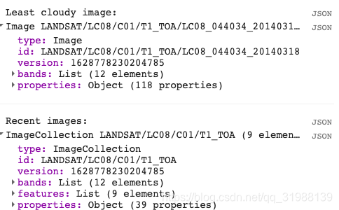 //加载影像并且以行列号的形式搜索影像并进行时间筛选最后打印出影像信息 var collection = ee.ImageCollection('LANDSAT/LC08/C01/T1_TOA') .filter(ee.Filter.eq('WRS_PATH', 44)) .filter(ee.Filter.eq('WRS_ROW', 34)) .filterDate('2014-03-01', '2014-08-01'); print('Collection: ', collection); // 统计影像的数量 var count = collection.size(); print('Count: ', count); // 从影像集合中获取影像时间的范围并且进行打印看看效果 var range = collection.reduceColumns(ee.Reducer.minMax(), ["system:time_start"]) print('Date range: ', ee.Date(range.get('min')), ee.Date(range.get('max'))) // 在集合中获取影像的属性值 var sunStats = collection.aggregate_stats('SUN_ELEVATION'); print('Sun elevation statistics: ', sunStats); // 获取影像的集合并进行云量筛选,获取云量最少的一幅 var image = ee.Image(collection.sort('CLOUD_COVER').first()); print('Least cloudy image: ', image); // 在时间上进行影像筛选获取获取最新的影像 var recent = collection.sort('system:time_start', false).limit(10); print('Recent images: ', recent);
