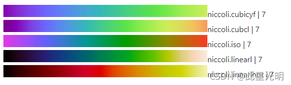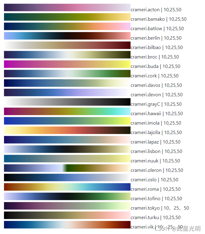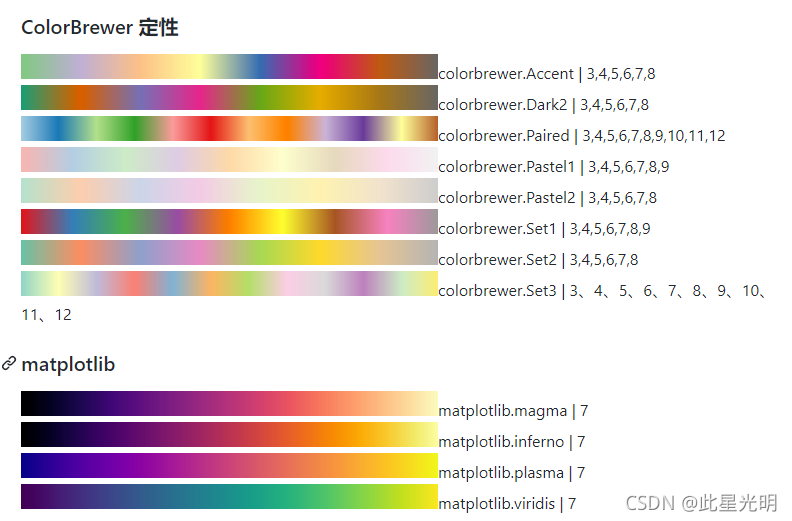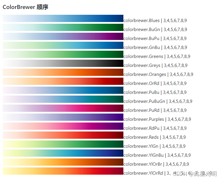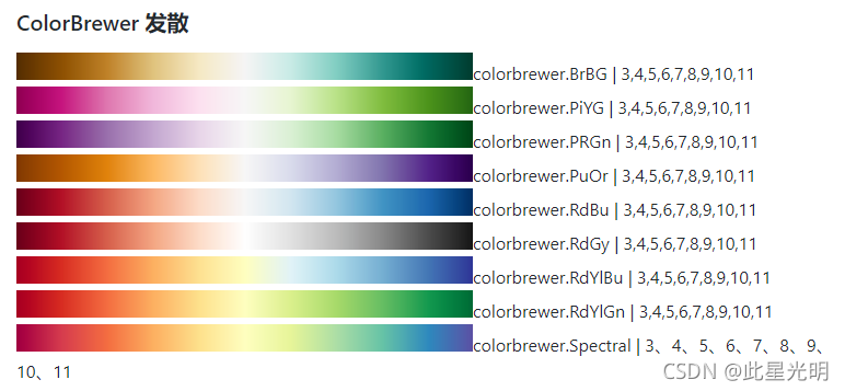 要检索所需的调色板,请使用 JS 对象表示法指定组、名称和颜色级别数。可用颜色的数量因调色板而异,这些调色板列在下面的调色板名称之后。请注意,所有非 ColorBrewer 调色板只有 7 种颜色,因此始终使用 7 作为这些调色板的“颜色级别”属性。