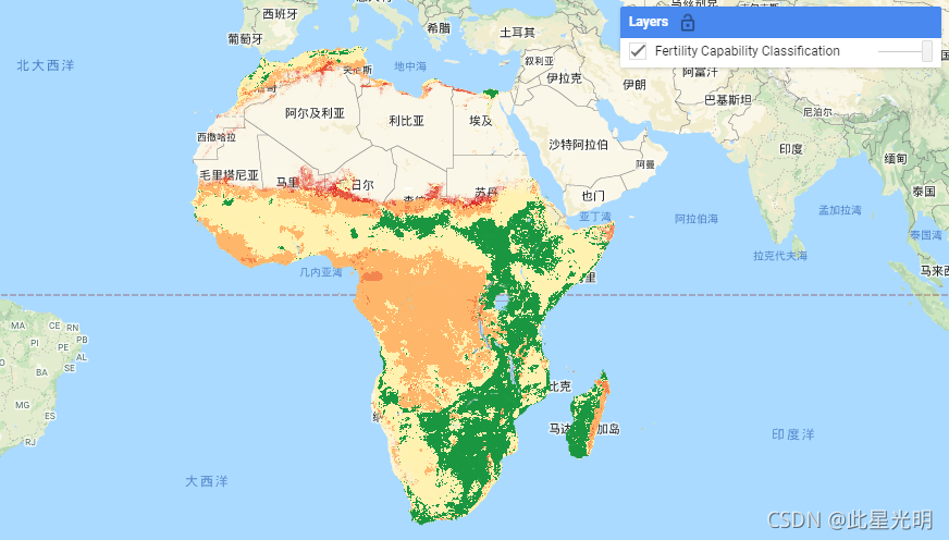 var raw = ee.Image("ISDASOIL/Africa/v1/fcc").select(0); var converted = ee.Image(raw.mod(3000).copyProperties(raw)); Map.setCenter(25, -3, 2); Map.addLayer(converted, {}, "Fertility Capability Classification");