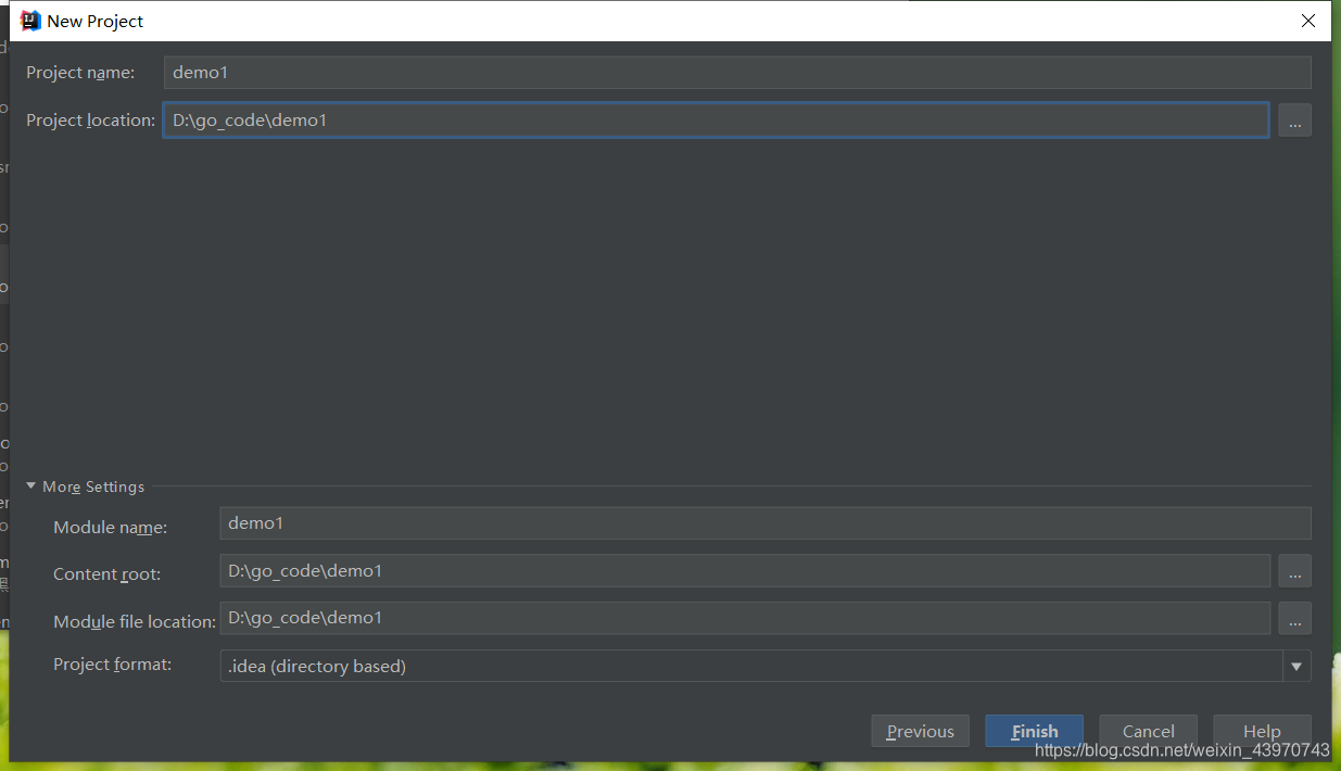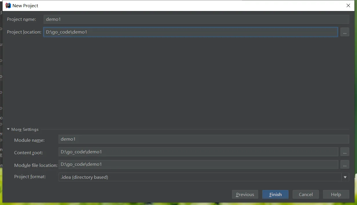 3.选择你配置GOPATH 的路径存放项目,我是自定义Project名叫demo1