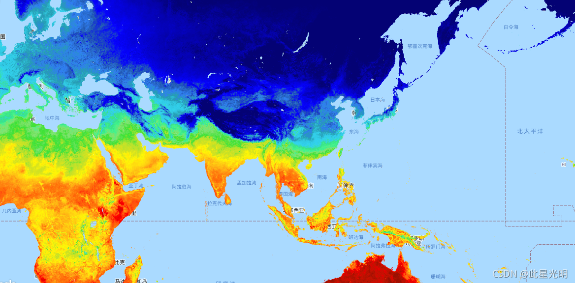 var dataset = ee.ImageCollection("JAXA/GCOM-C/L3/LAND/LST/V1") .filterDate('2020-01-01', '2020-02-01'); // Multiply with slope coefficient var dataset = dataset.mean().multiply(0.02).log10(); var visualization = { bands: ['LST_AVE'], min: 2.4, max: 2.5, palette: [ "040274","040281","0502a3","0502b8","0502ce","0502e6", "0602ff","235cb1","307ef3","269db1","30c8e2","32d3ef", "3be285","3ff38f","86e26f","3ae237","b5e22e","d6e21f", "fff705","ffd611","ffb613","ff8b13","ff6e08","ff500d", "ff0000","de0101","c21301","a71001","911003", ] }; Map.setCenter(128.45, 33.33, 5); Map.addLayer(dataset, visualization, "Land Surface Temperature");