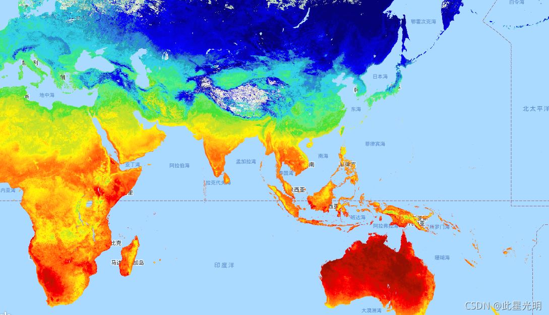 var dataset = ee.ImageCollection("JAXA/GCOM-C/L3/LAND/LST/V2") .filterDate('2020-01-01', '2020-02-01'); // Multiply with slope coefficient var dataset = dataset.mean().multiply(0.02).log10(); var visualization = { bands: ['LST_AVE'], min: 2.4, max: 2.5, palette: [ "040274","040281","0502a3","0502b8","0502ce","0502e6", "0602ff","235cb1","307ef3","269db1","30c8e2","32d3ef", "3be285","3ff38f","86e26f","3ae237","b5e22e","d6e21f", "fff705","ffd611","ffb613","ff8b13","ff6e08","ff500d", "ff0000","de0101","c21301","a71001","911003", ] }; Map.setCenter(128.45, 33.33, 5); Map.addLayer(dataset, visualization, "Land Surface Temperature");