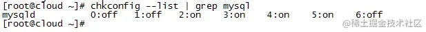 使用service mysqld start来启动mysql服务(第一次会输出很多信息),之后就不会了。 然后我们可以使用chkconfig mysqld on命令将mysql设置为开机启动。 输入chkconfig --list | grep mysql命令显示如下图: