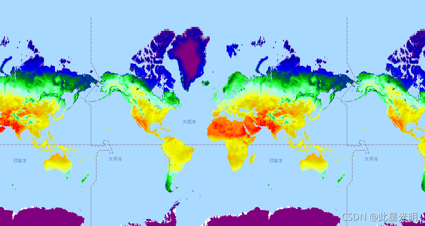 该日间产品的基础数据集是MODIS陆地表面温度数据(MOD11A2),采用Weiss等人(2014)所述的方法填补缺口,以消除由云层等因素造成的数据缺失。然后将无间隙输出在时间和空间上进行汇总,以产生每月≈5公里的产品。