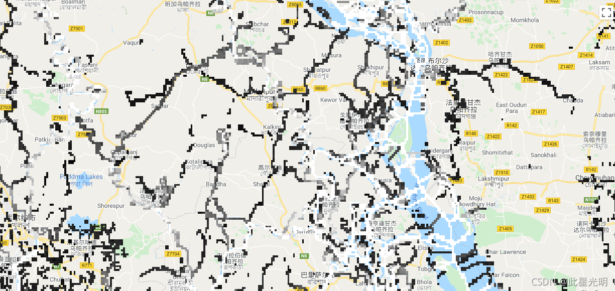 水体地图。DEM陆海掩码和水体数据之间存在一些不一致的地方(如沿海的新岛屿)。OpenStreeetMap水体层的质量在所有地区都不一致。