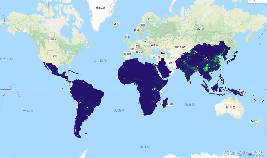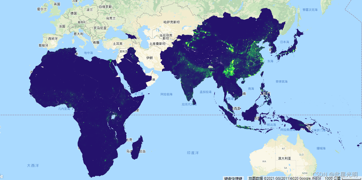 var dataset = ee.ImageCollection('WorldPop/POP'); var population = dataset.select('population'); var populationVis = { min: 0.0, max: 50.0, palette: ['24126c', '1fff4f', 'd4ff50'], }; Map.setCenter(113.643, 34.769, 7); Map.addLayer(population, populationVis, 'Population');