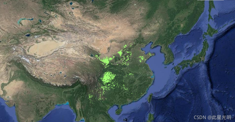 var image = ee.Image('Tsinghua/DESS/ChinaTerraceMap/v1'); var image = image.updateMask(image); Map.addLayer( image, {min:0, max:1, palette: ['a3ff74']}, 'Terraces'); Map.setCenter(106.6, 30.4, 10); Map.setOptions("SATELLITE");