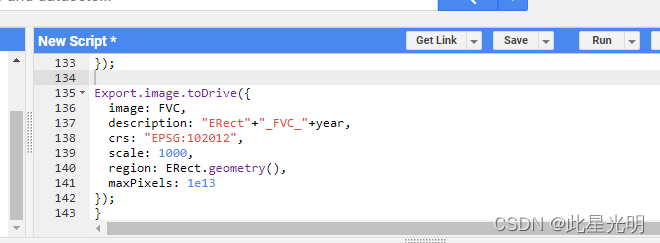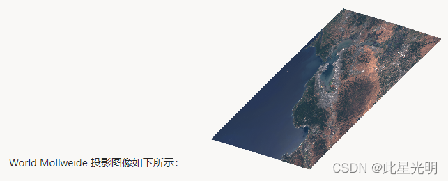 // 加载一个简单的Landsat8影像 var image = ee.Image('LANDSAT/LC08/C01/T1_TOA/LC08_044034_20170614'); // 获取研究区的边界坐标 var bounds = image.geometry().bounds().getInfo()['coordinates']; print('Original image (UTM) URL:', image.getThumbURL({ bands: ['B4', 'B3', 'B2'], min: 0, max: 0.3, dimensions: '400' }) ); // Project the image to Mollweide. var wkt = ' \ PROJCS["World_Mollweide", \ GEOGCS["GCS_WGS_1984", \ DATUM["WGS_1984", \ SPHEROID["WGS_1984",6378137,298.257223563]], \ PRIMEM["Greenwich",0], \ UNIT["Degree",0.017453292519943295]], \ PROJECTION["Mollweide"], \ PARAMETER["False_Easting",0], \ PARAMETER["False_Northing",0], \ PARAMETER["Central_Meridian",0], \ UNIT["Meter",1], \ AUTHORITY["EPSG","54009"]]'; //设置新的坐标系统 var proj_mollweide = ee.Projection(wkt); //将影像进行重投影 var image_mollweide = image.reproject({ crs: proj_mollweide, scale: 300 }); print('Projected image (World Mollweide) URL:', image_mollweide.getThumbURL({ bands: ['B4', 'B3', 'B2'], min: 0, max: 0.3, region: bounds, dimensions: '400' }) );