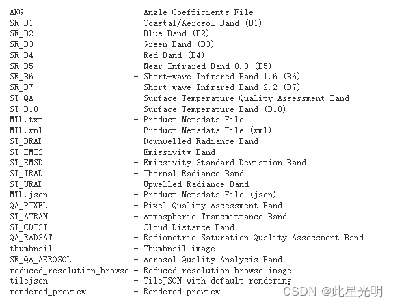 集合具有有关它们包含的STAC 项目的信息。例如,在这里我们查看可用于Landsat 8 Collection 2 Level 2数据的波段: