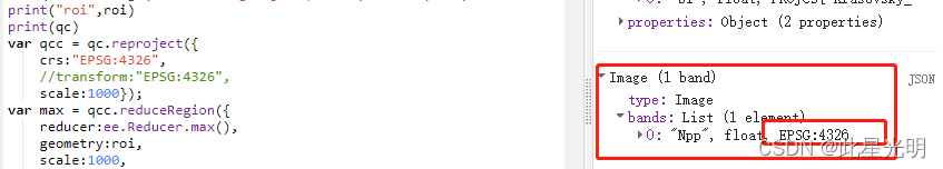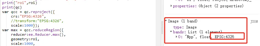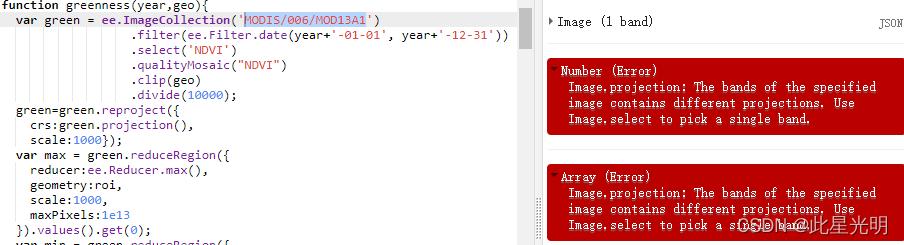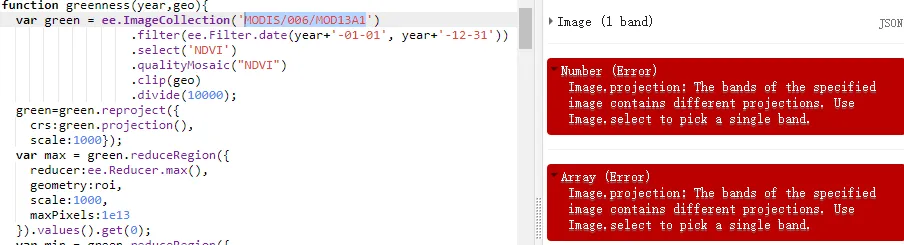 Image.projection: 指定图像的波段包含不同的投影。使用Image.select来挑选单一的波段,这里的问题在于不是一个坐标系统是无法进行披头投影的