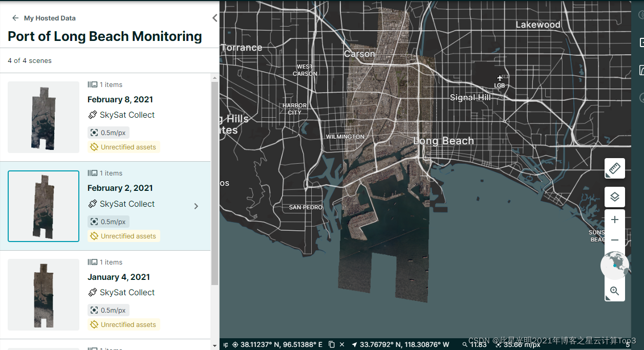目前这个限定的区域全是靠近赤道区域附近,这个界面你可以实现关于研究区的矢量上传,距离测量和面积量测。这里面的使用的卫星是skysat卫星