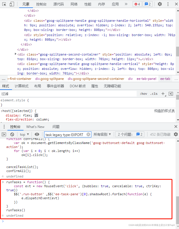 //参考于Exporting images without clicking on RUN button (google.com) runTasks = function() { const evt = new MouseEvent('click', {bubbles: true, cancelable: true, ctrlKey: true}) $$('.run-button' ,$$('ee-task-pane')[0].shadowRoot).forEach(function(e) { e.dispatchEvent(evt) }) } runTasks()