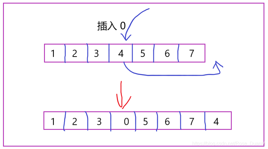 先来看看插入操作,假如有一个数组 [3, 4, 6, 8, 7, 2, 5],第一种情况是插入的元素位于数组的最后一个位置,那么不用进行数据搬移,时间复杂度为 O(1) ,如果插入的位置是第一个,那么必须移动整个数组,时间复杂度为 O(n) 。