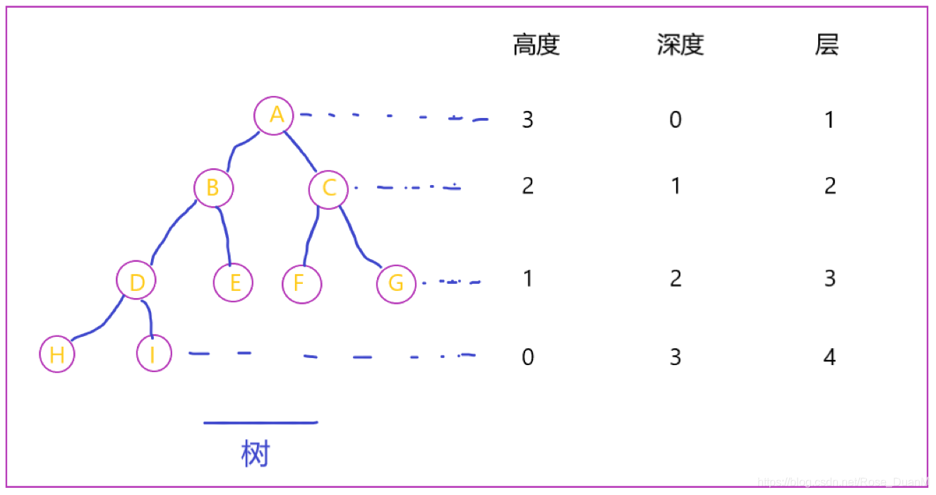 树的节点还涉及到三个概念,分别是高度、深度、层。