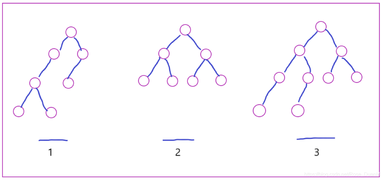 满二叉树:树的叶子节点全在最底层,并且除了叶子节点,每个节点都有左右两个子节点,例如上图中的树 2。