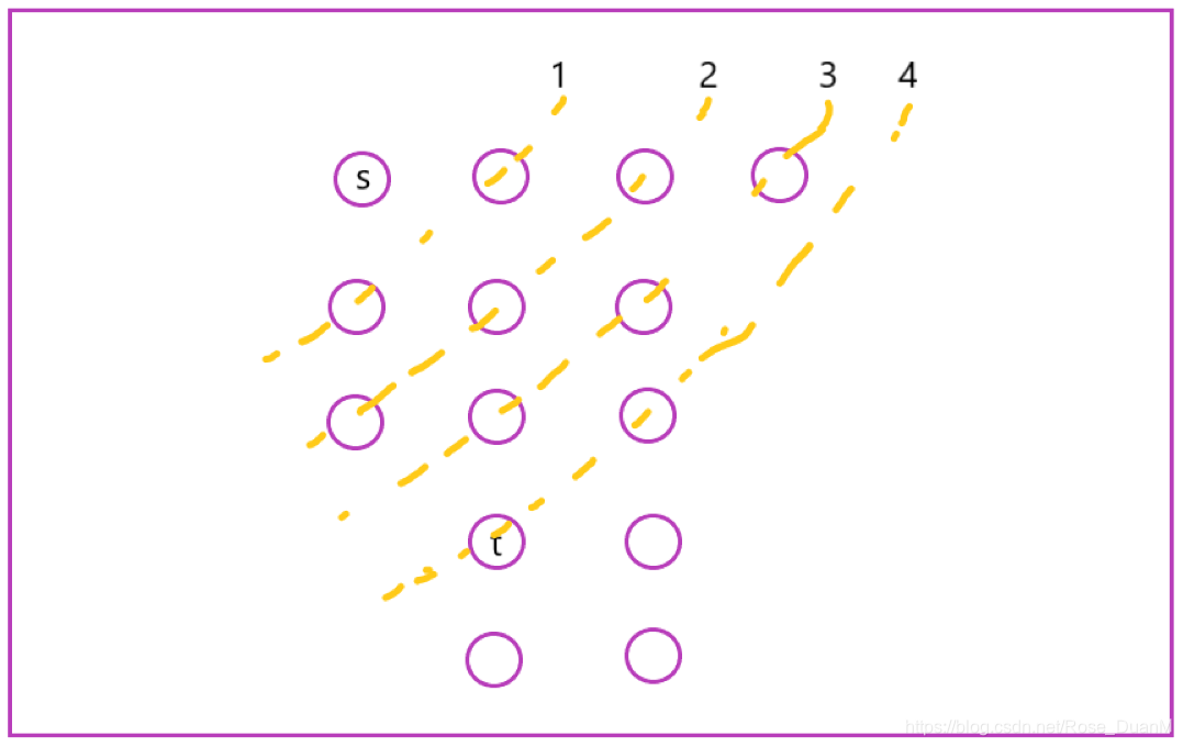 广度优先搜索的基本思路就是从一个顶点出发,层层遍历,直到找到目标顶点,其实这样搜索出来的路径也就是两个顶点之间的最短距离。如下图所示,例如要搜索出顶点 s -> t 的路径,搜索的方式就是这样的: