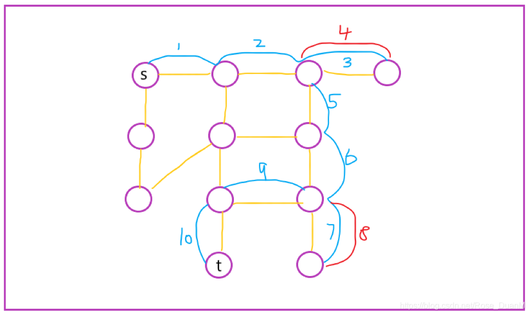 图中从顶点 s 出发,蓝色的表示前进的顶点,红色的表示后退一个顶点,直到找到目标顶点 t,相信你可以看出来,这样搜索出来的路径其实并不是 s 到 t 的最短路径,而是任意的一条路径。