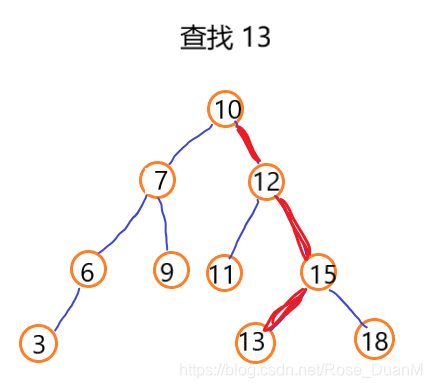 我们直接拿查找的数据和根节点数据作比较,如果大于根节点,则在右子树中递归查找,如果小于根节点,则在左子树中查找,如果等于,则直接返回。就像下图的查找过程: