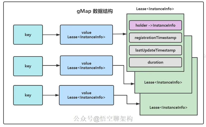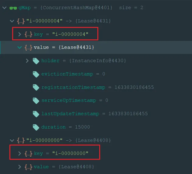 key就是一个 唯一 id,String 类型。值类似这种:i-00000004value里面存的是 Lease。Lease是一个类,里面持有一个 instanceInfo 的 holder。这个 instanceInfo 就是注册过来的服务实例信息,包含 ip 地址,端口号等。