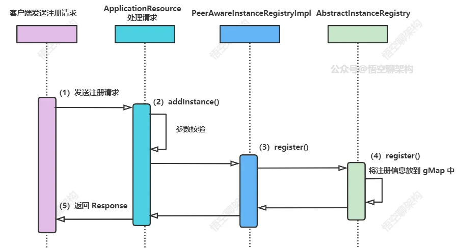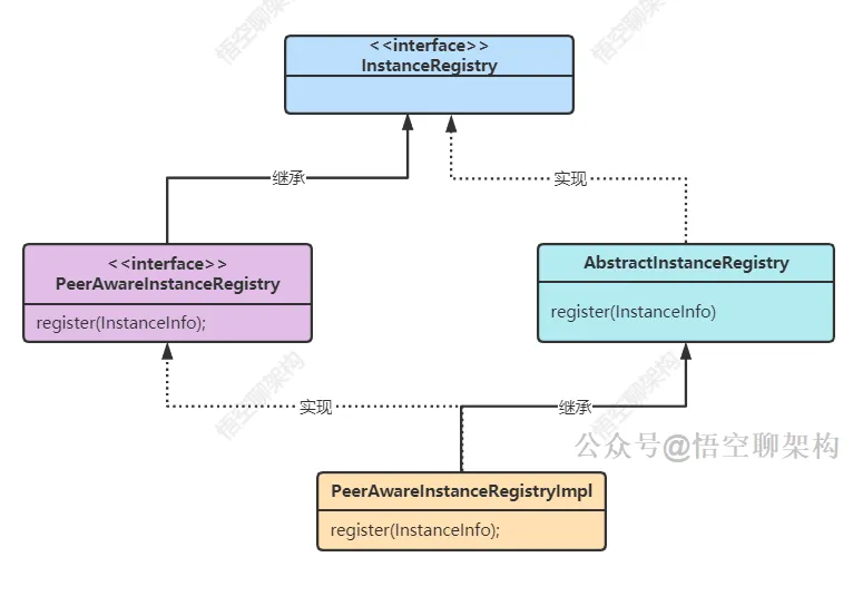 调用它的 register() 方法后会调用抽象类 AbstractInstanceRegistry 的 register() 方法,核心代码就是在这个抽象类的 register() 方法。另外要说下的就是上面的抽象类和接口分别实现和继承了接口 InstanceRegistry。