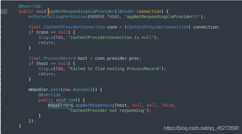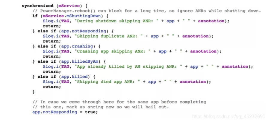 2.进入到AMS中,AppError会先进行筛选(1.当前进程正在进行dump流程 2.已经发生crash 3. 已经被系统kill 4.系统是否正在关机等情况),如果都不符合,则认为当前进程发生了anr。