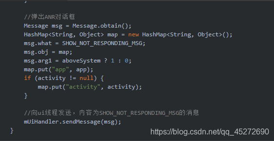4.在收集完第一步信息后,接下来便开始统计各进程本地的更多信息,如虚拟机信息,java线程状态及堆栈。首先会弹出一个ANR的对话框,然后向UI线程发送SHOW_NOT_RESPONDING_MSG消息